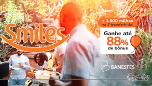 Clientes Smiles que transferirem pontos do cartão de crédito Banestes para a Smiles até 03/10/2025 podem garantir até 88% de bônus e ainda receber 1.500 milhas extras na primeira transferência.